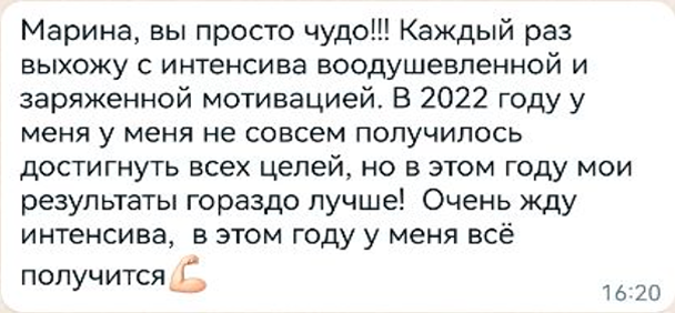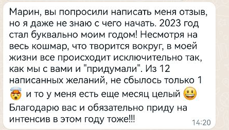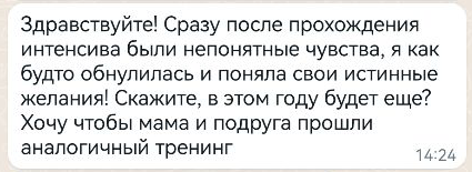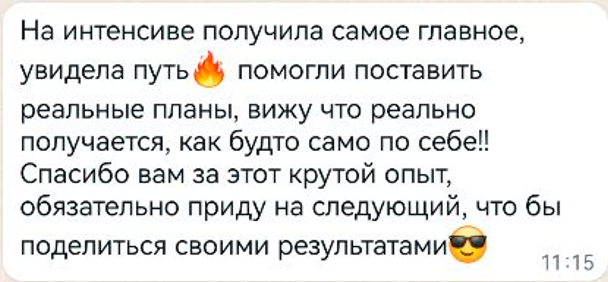 Интенсив также поможет тебе развить навыки самоорганизации, управления стрессом и повышения продуктивности. В результате ты сможешь лучше контролировать свою жизнь, достигнешь больших успехов в работе и личной жизни, а также почувствуешь себя более уверенной и спокойной. Исполнишь свои желания с легкостью, экологично и не нарушая границ в остальных сферах жизни.
